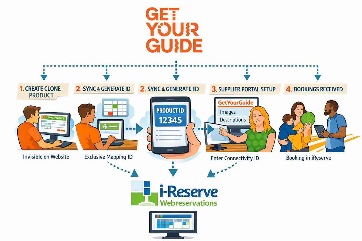 The GetYourGuide integration allows products from iReserve to be published on the GetYourGuide platform. Customers can book via GetYourGuide, while the booking is automatically processed in i-Reserve.