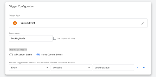 In de definitie staat verder "This trigger fires on". Kies hier voor "Some custom Events" en